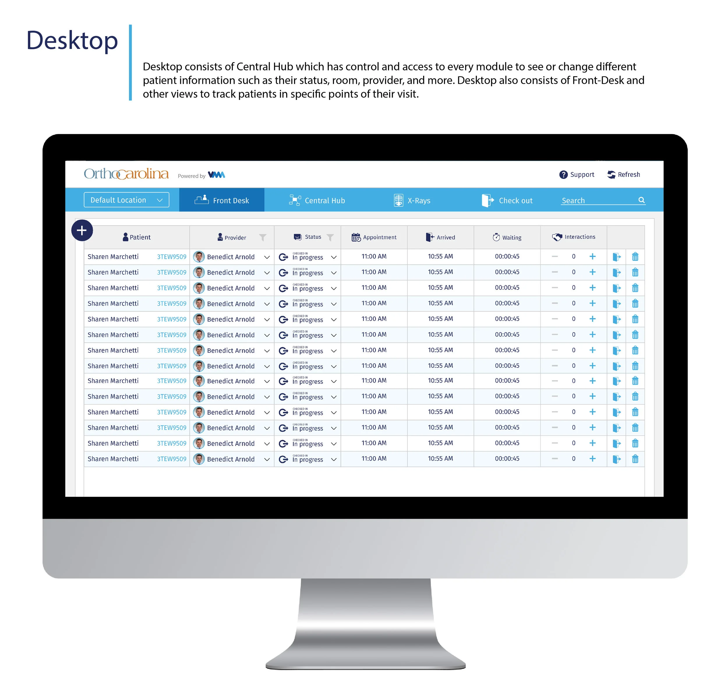 See and manage the status and time of patients through out their visit and what doctor they have been assigned to.